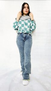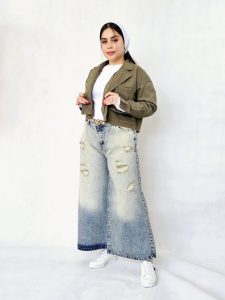 شلوارهای دمپا گشاد یا بوتکات بهترین گزینه میتونه باشه. تعادل بین بالاتنه و پایین تنه ایجاد میکنند.